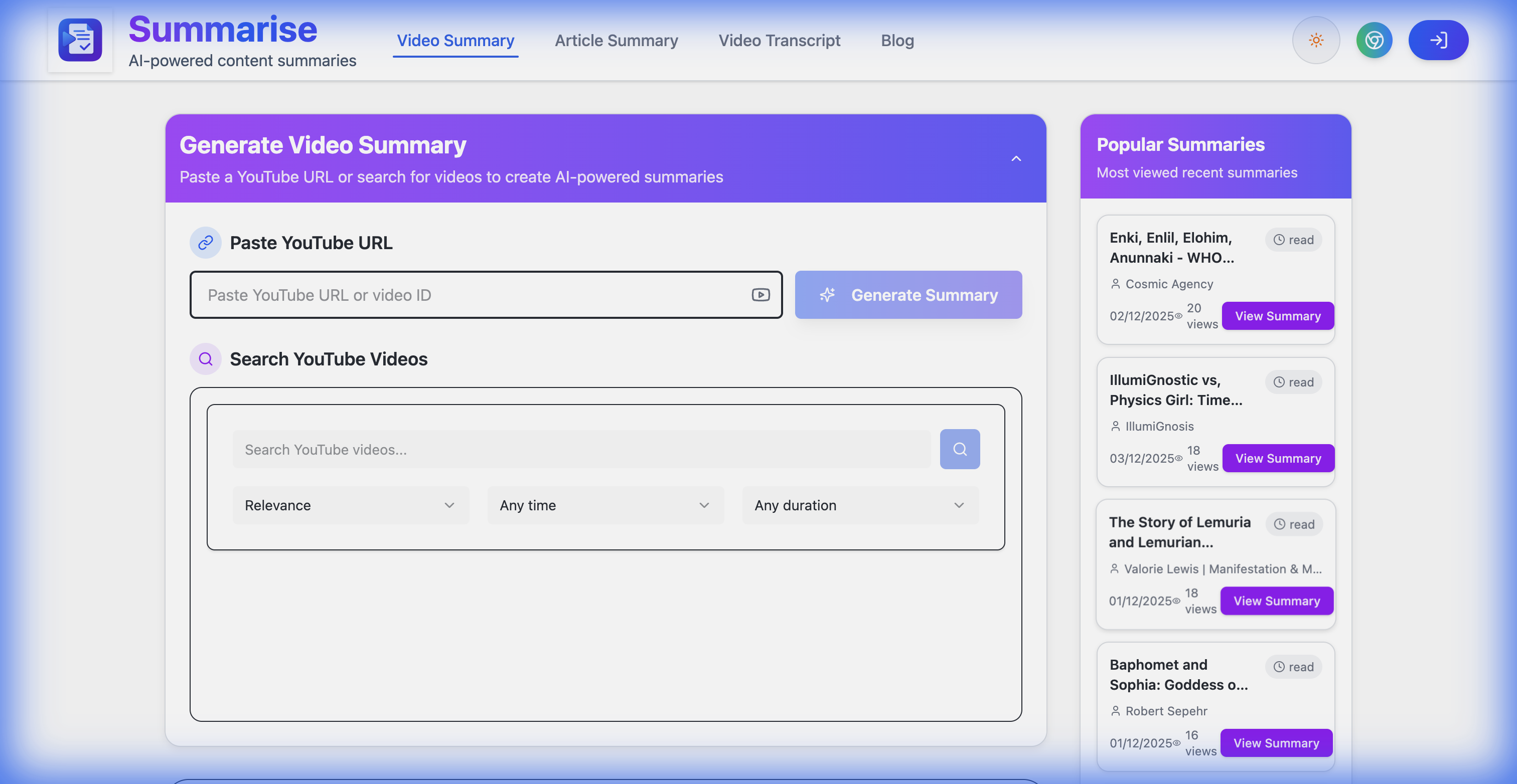 Don't have a URL? No problem. You can search for YouTube videos right from the Summarise page using the built-in search. Filter by relevance, upload date, or video duration to find exactly what you need — then generate the summary without leaving the page.