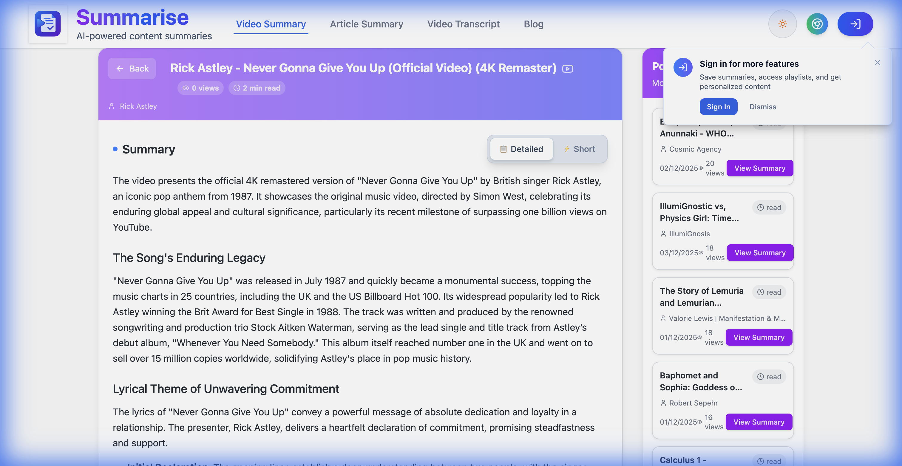 The AI processes the video's transcript and generates a well-structured summary with clear sections, key points, and important details. You get two modes: