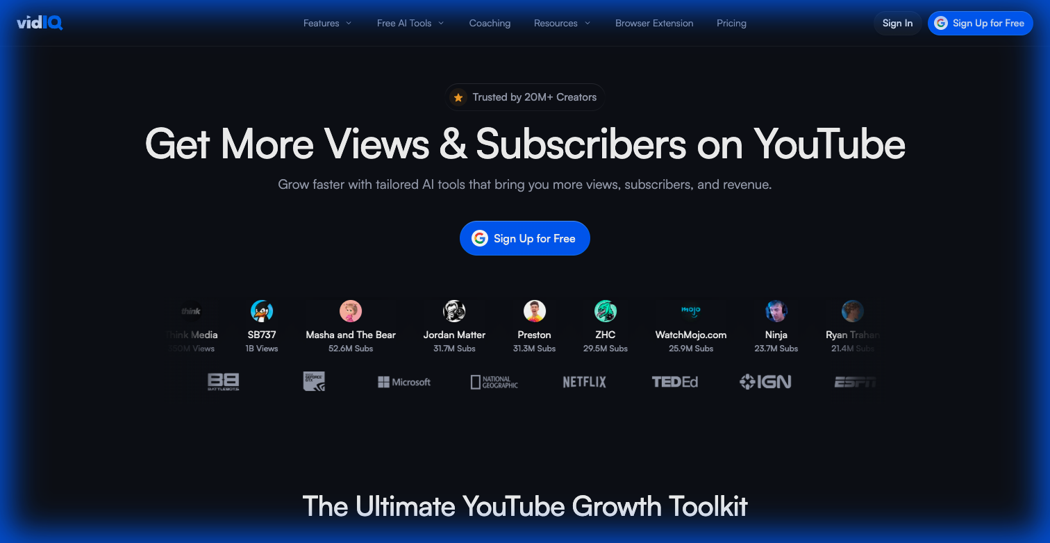 | VidIQ | Data-Backed Ideas | Free / Boost Plan | AI Coach with Channel Audit |