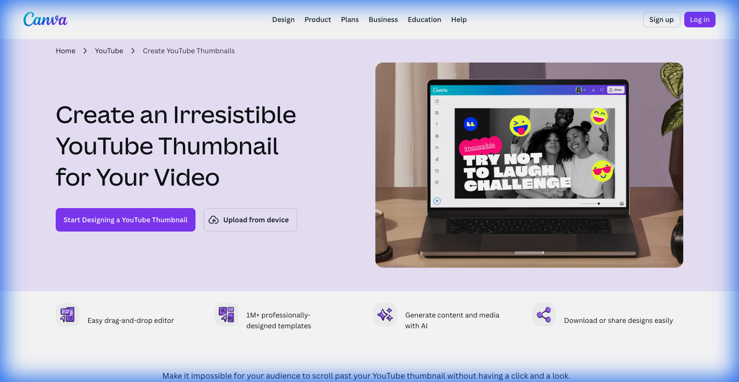 Canva's YouTube thumbnail maker page