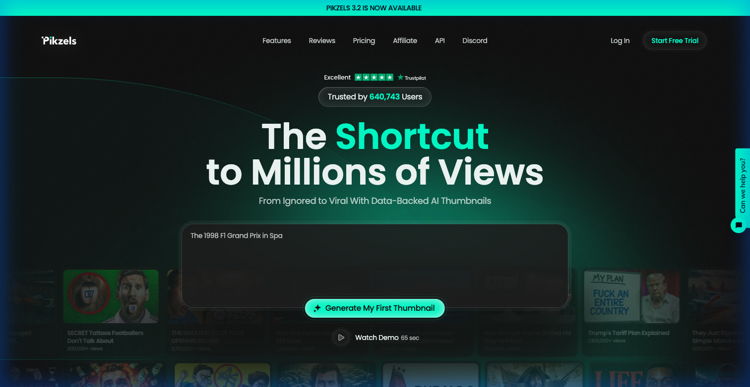 Where it falls short: Honestly? The results are inconsistent. You might generate 10 thumbnails and find 2 that are usable. Text rendering in AI-generated images still has issues (expect occasional gibberish text overlays). Most creators use Pikzels to get 80% of the way there, then finish in Canva. Also, the free trial is extremely limited — the watermark on free thumbnails makes them barely usable, and paid plans start around $20/month for 200 credits.