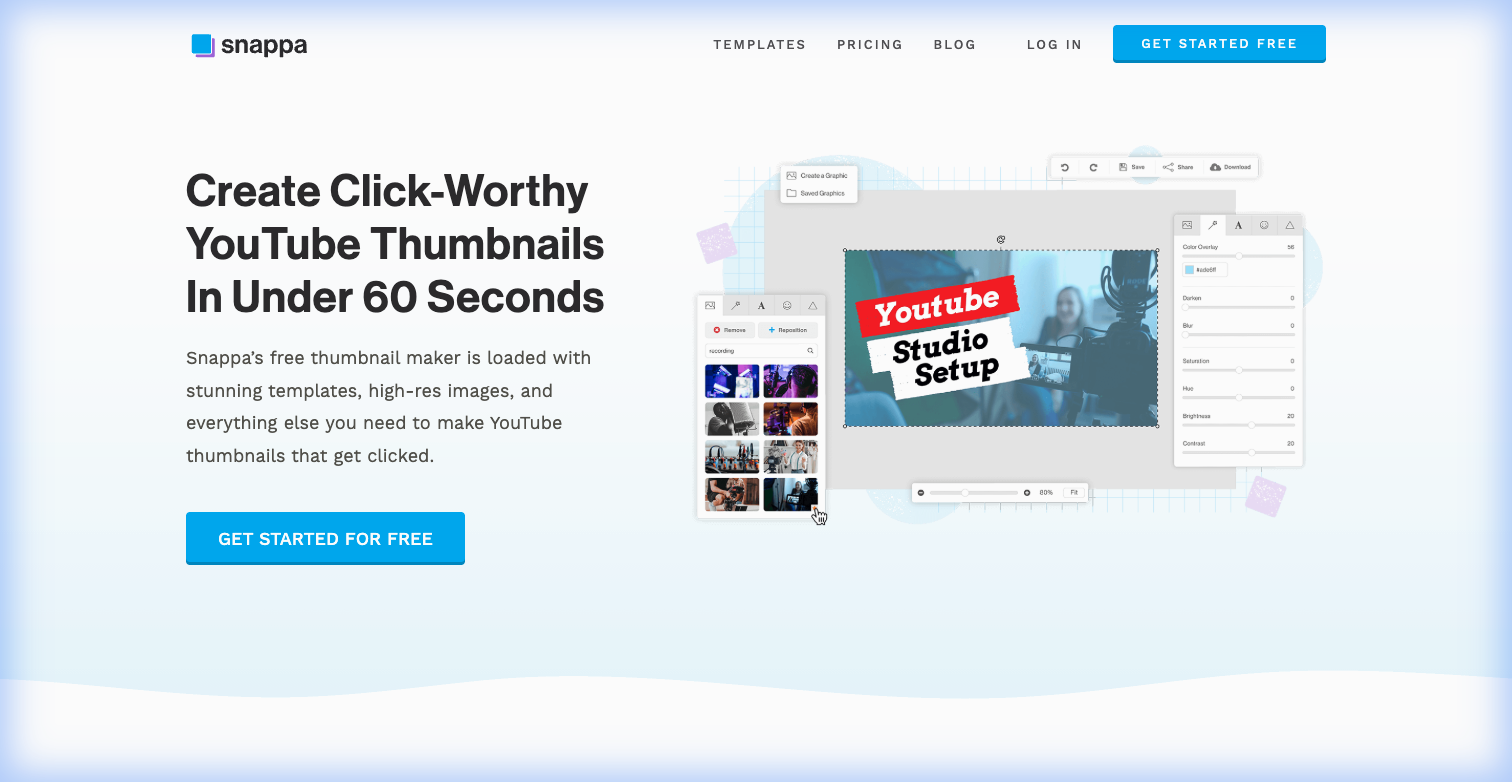 Snappa's entire value proposition is speed. Open the editor, pick a pre-sized YouTube thumbnail template, swap in your text and image, download. Done. The whole process takes roughly 2-3 minutes if you know what you want.